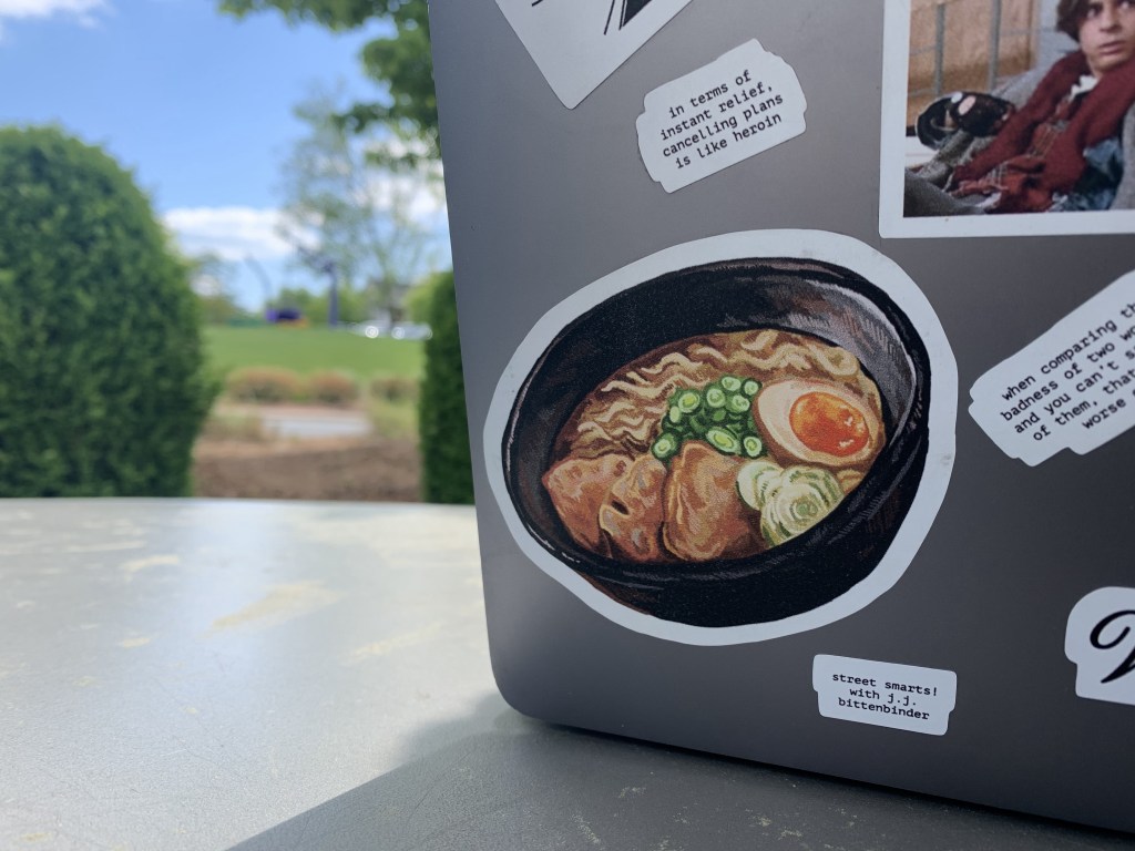 Greenwalt takes pride in his curation, selecting stickers ranging from John Mulaney quotes (his favorite comedian) to John Bender from “The Breakfast Club.” A large, watercolor rendering of a ramen bowl symbolizes more than just a meal.