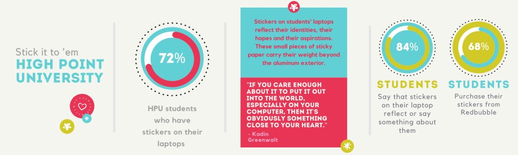 High Point University students are taking advantage of the medium. Out of 71 responses, 72% of HPU students reported that they have stickers on their laptops.