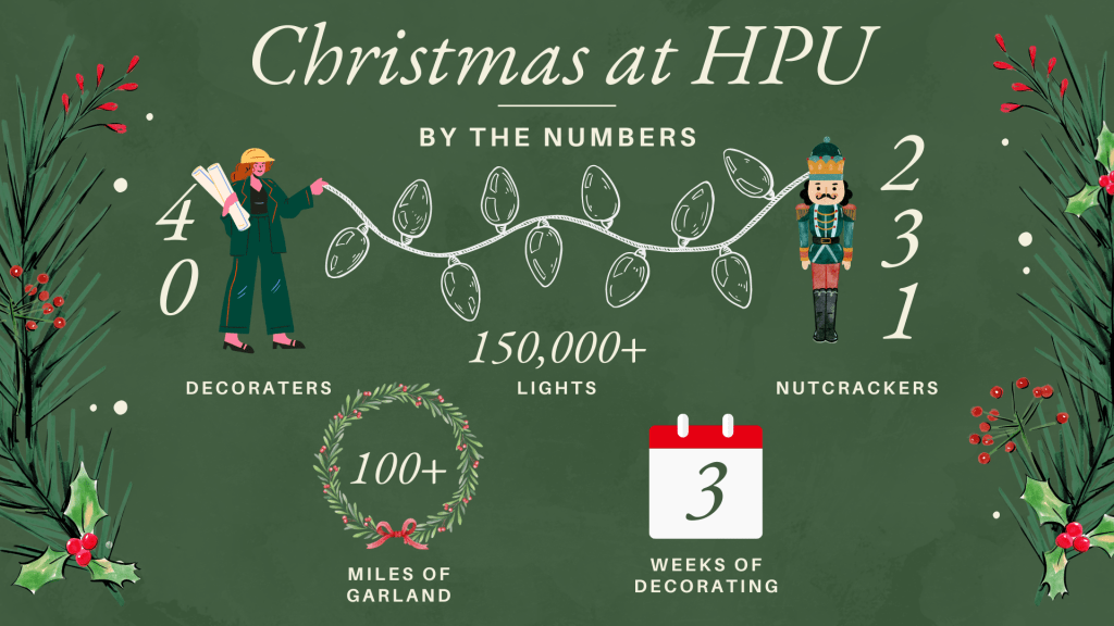 “Decorating for Christmas is one of HPU’s most loved traditions. We decorate campus before Thanksgiving so students can enjoy the decorations before winter break,” said Ayers. “We open campus to the community for a drive through event to experience the decorations as well. At HPU, God, family and country are important values we cherish and especially at Christmas!”